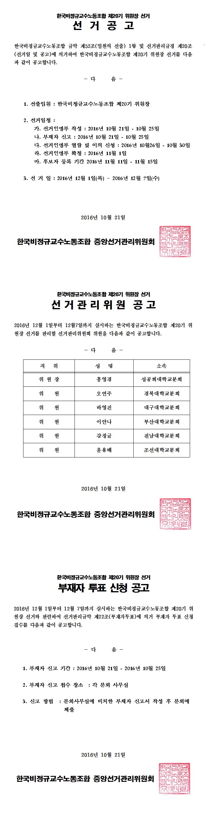 한국비정규교수노동조합 20기 위원장 선거 공고 페이지 정보 작성자 관리자 작성일16-10-20 19:44 조회8,898회 댓글0건 이전글 다음글 목록 본문 한국비정규교수노동조합 20기 위원장 선거 공고 추천 0 댓글목록 등록된 댓글이 없습니다. 이전글 다음글 목록
