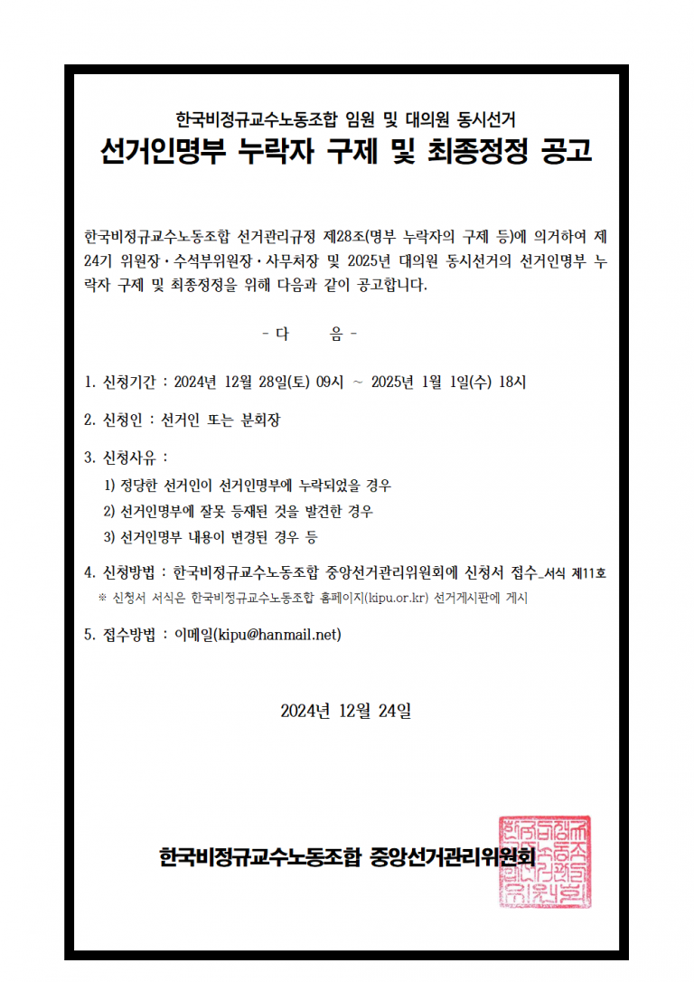 한교조 임원 및 대의원 동시선거 선거인명부 누락자 구제 및 최종정정 공고 페이지 정보 작성자 관리자 작성일24-12-24 14:31 조회3,031회 댓글0건 이전글 다음글 목록 본문 GKSRYWH DLANDNJ A 추천 0 댓글목록 등록된 댓글이 없습니다. 이전글 다음글 목록